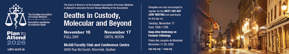 Join the Canadian Association of Forensic Medicine for its 2026 Annual Scientific Meeting, bringing together leading experts to explore advancements in forensic pathology, including deaths in custody and molecular developments.